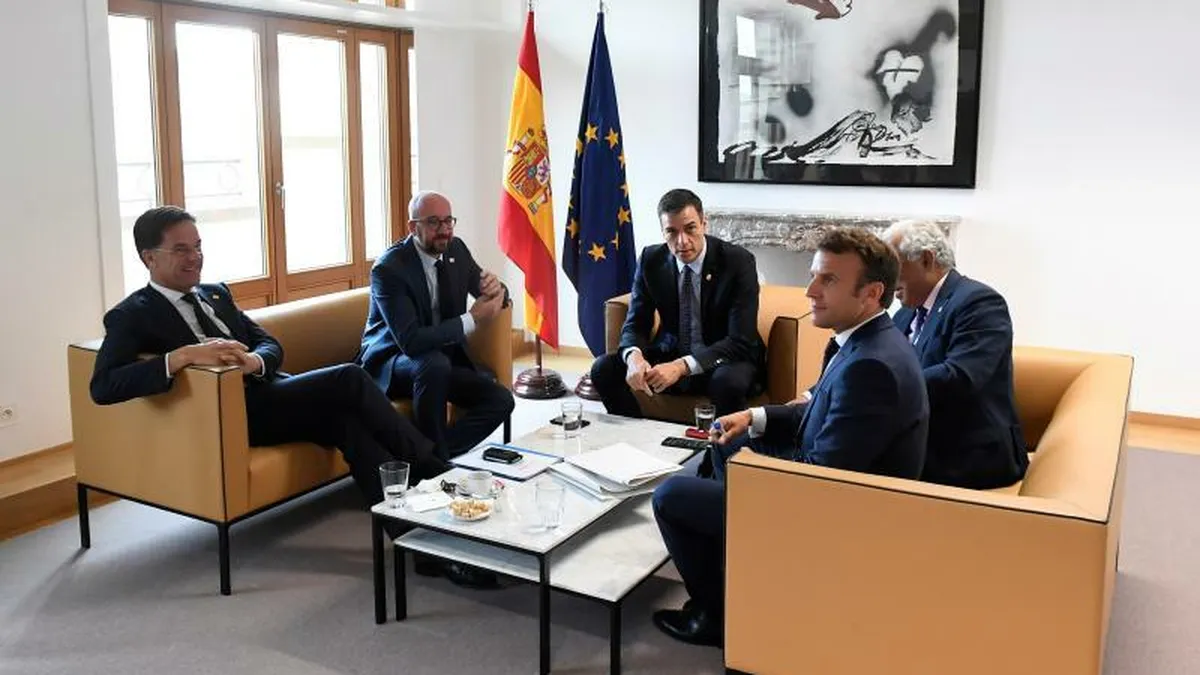 El presidente del Gobierno español en funciones, Pedro Sánchez (c), junto a los primer ministros de Holanda, Mark Rutte, Bélgica, Charles Michel, Portugal António Costa, y Francia, Emmanuel Macron (de izda a dcha), durante la reunión que mantuvieron esta mañana, previa a la tercera jornada de la cumbre de líderes de la Unión Europea. / EFE