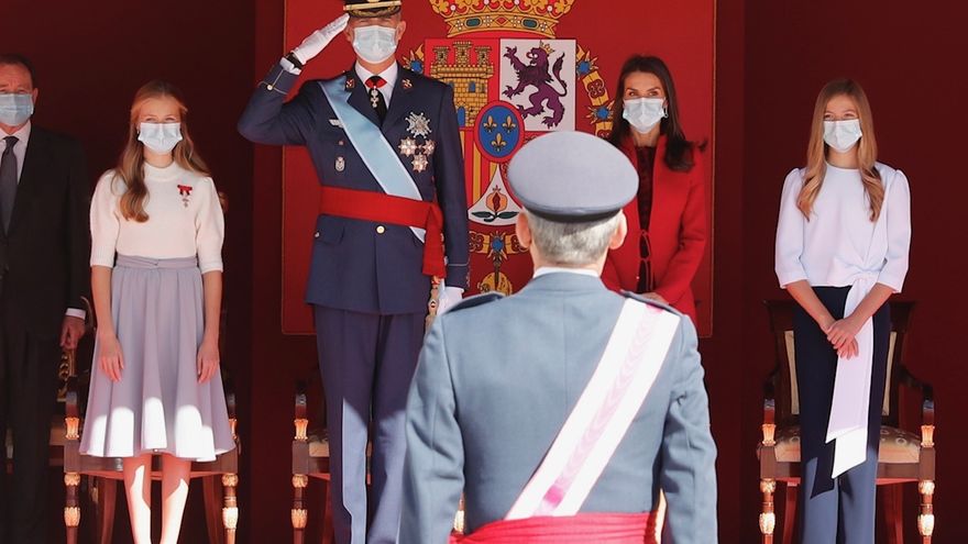El tradicional desfile militar que anualmente se desarrolla en el Paseo de la Castellana, arteria principal de Madrid, se trasladó en formato reducido a la Plaza de la Armería del Palacio Real, donde se reunieron las principales autoridades españolas con todas las medidas de seguridad por el COVID.