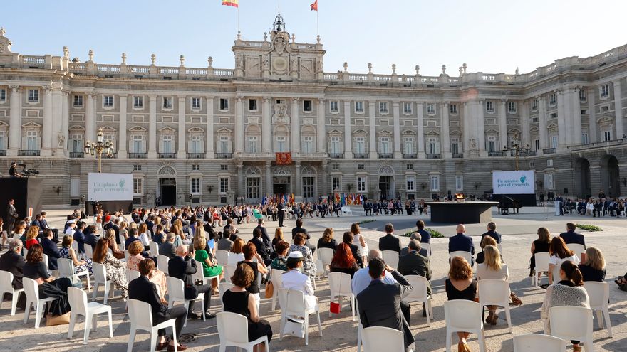 Madrid, España/El Palacio Real de Madrid fue escenario este viernes de un nuevo homenaje de Estado a los más de 100.000 muertos del covid en España, en el que Felipe VI dijo que la pandemia fue un "triste punto y aparte para muchos ciudadanos españoles".