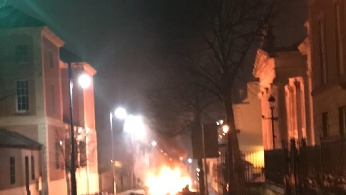 Un auto en llamas tras un presunto coche bomba en Londonderry, Irlanda del Norte. / AFP
