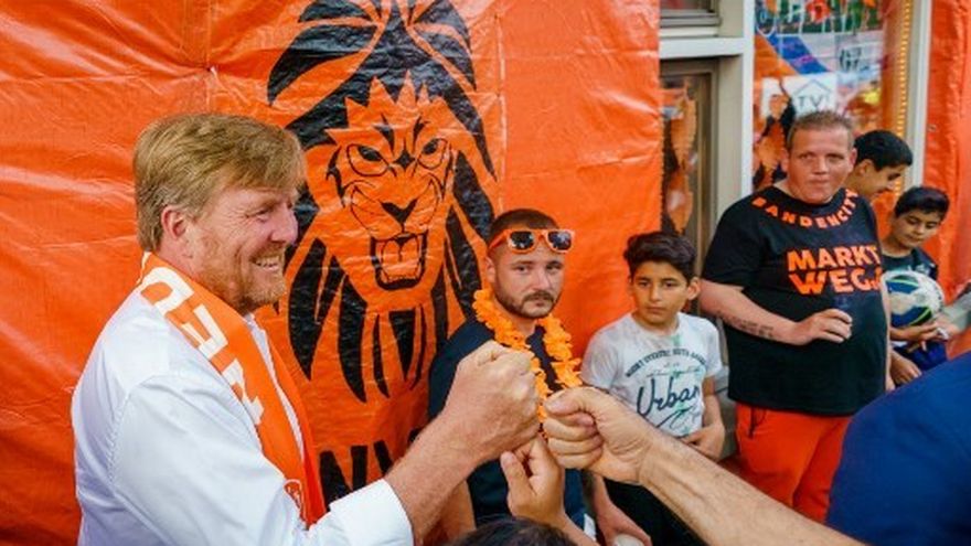 De visita en la más hermosa "calle naranja" del país el jueves, decorada con los colores del equipo nacional y en plena ebullición antes del encuentro de la Eurocopa entre Holanda y Austria, el rey Guillermo Alejandro saludó y no respetó las medidas anticovid.