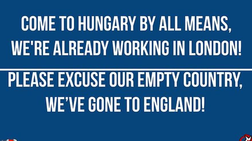 Cientos de carteles con leyendas satíricas como "Lo siento por nuestro primer ministro" y "Ven a Hungría, tenemos empleos en Londres" fueron pegados en las calles de las ciudades húngaras para contrarrestar la campaña antinmigrante del gobierno.