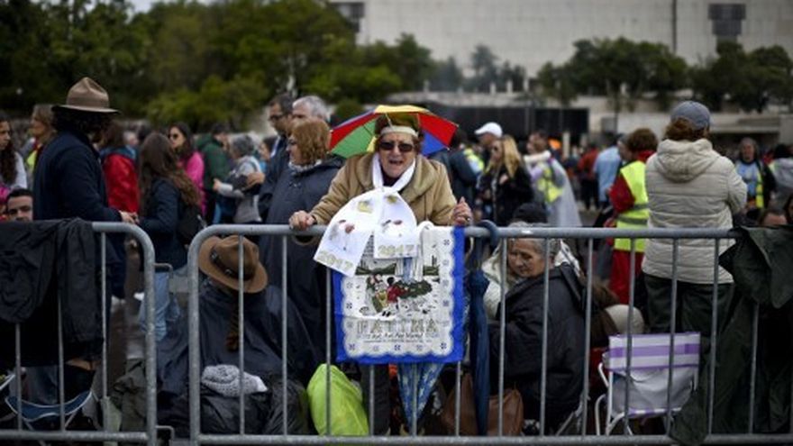 Desafiando la lluvia, decenas de miles de católicos venidos del mundo entero se concentran en la explanada frente a la Basílica de Nuestra Señora de Fátima, en el centro de Portugal, en espera del pontífice argentino.