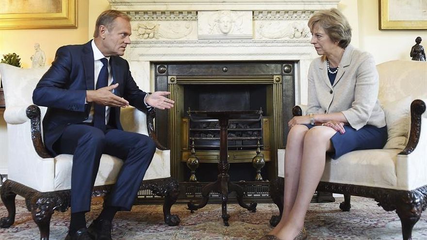 La líder tory recibió esta mañana en su despacho de Downing Street al presidente del Consejo Europeo, Donald Tusk, para abordar principalmente aspectos del divorcio del Reino Unido del bloque comunitario después de que esa opción triunfara en el referendo del 23 de junio.