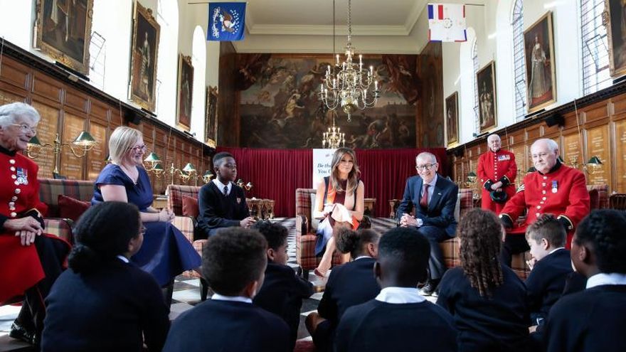 La primera dama de Estados Unidos, Melania Trump, visitó hoy el Royal Hospital Chelsea, ubicado en el suroeste de Londres, como parte de su agenda oficial en el Reino Unido donde acompaña a su esposo, Donald Trump, en su primer viaje de trabajo como presidente a este país.