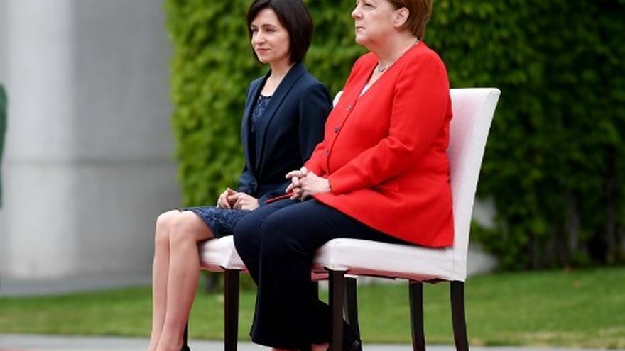 La canciller alemán se sentó en una silla blanca al lado de la primera ministra moldava Maia Sandu mientras sonaban los himnos de cada país.