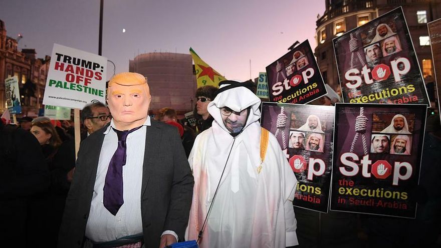 Coreando al unísono "No a Trump, no a la OTAN", los manifestantes se desplazaron hacia el Palacio de Buckingham, donde la reina Isabel II estaba dando la bienvenida a los líderes de los países aliados.