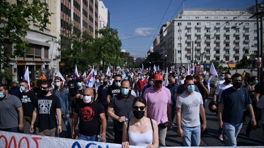 "No estamos contra las vacunas, sino contra el fascismo" y "¡Viva la democracia!", se leía en las pancartas de los manifestantes, que llevaban también banderas griegas.