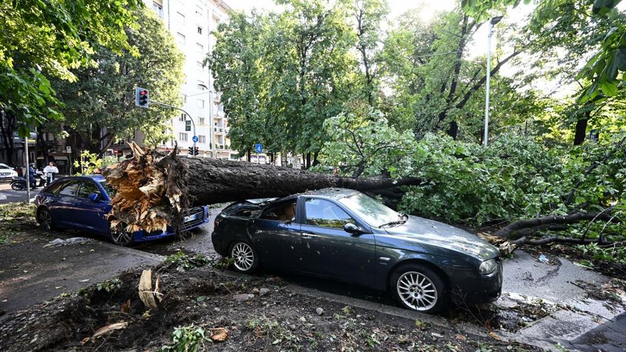 En Milán, las intensas precipitaciones de lluvia y granizo y el fuerte viento que azotó la capital económica del país provocaron inundaciones y tumbaron varios árboles, que cayeron sobre la calzada.