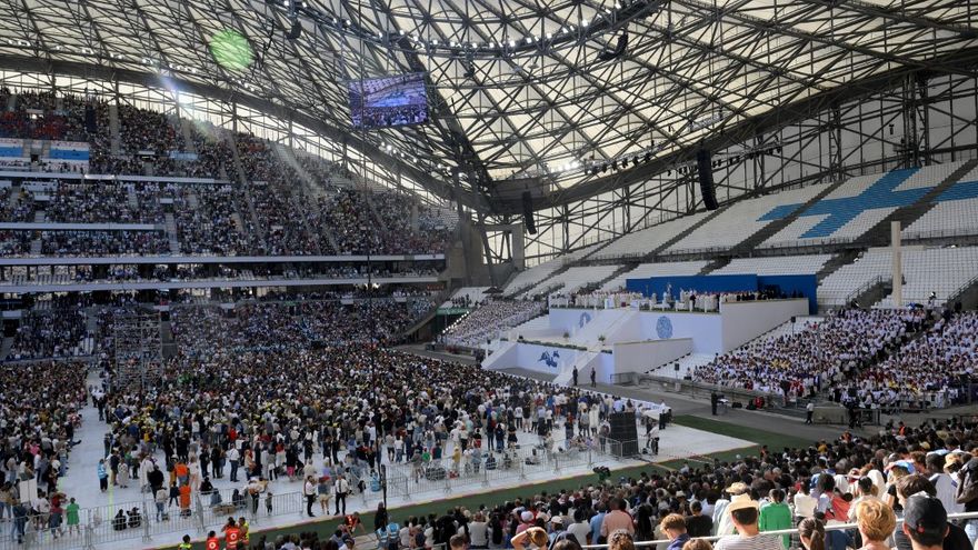 Poco antes de las 16H00 (14H00 GMT), el papamóvil del pontífice argentino hizo su entrada en el Estadio Velódromo, tras recorrer las calles de la ciudad mediterránea, donde fue acogido entre aplausos del público --las autoridades esperaban 57.000 personas-- y gritos de "¡Papa Francesco!".