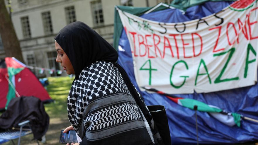 Los manifestantes, algunos de los cuales vestían la kufiya, símbolo de la causa palestina, se sentaron frente a tiendas de campaña enarbolando pancartas.