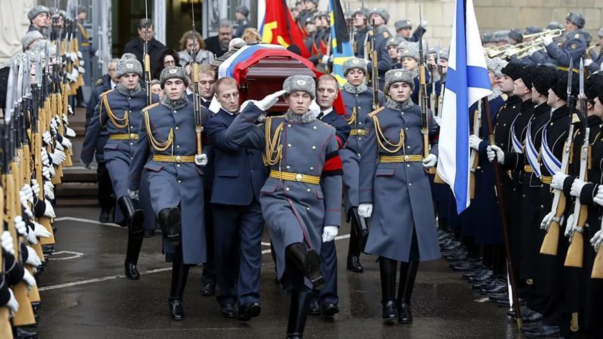 El féretro con los restos del diplomático estaba flanqueado por una guardia de honor, banderas rusas y coronas de flores.