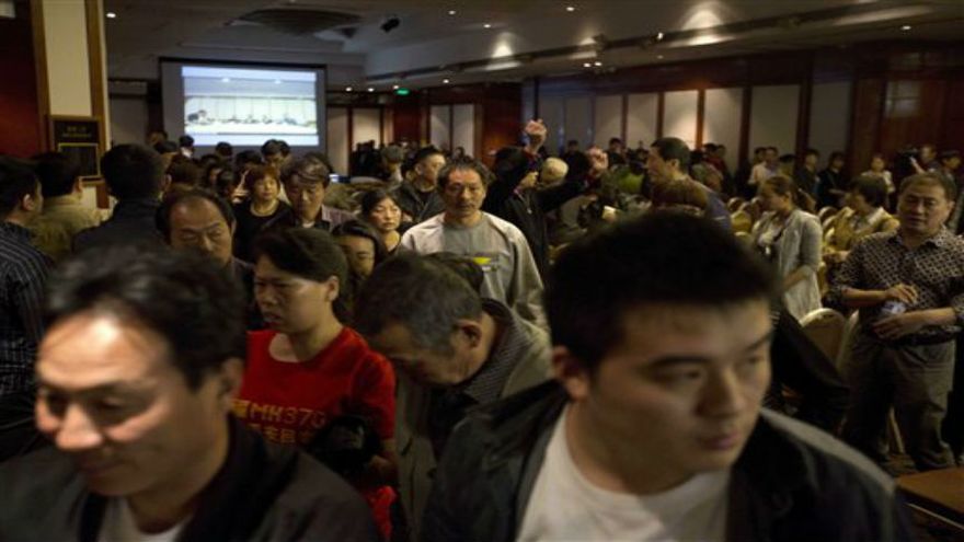 Mientras un robot sumergible descendía en el océano en un intento para localizar restos del avión perdido de Malaysia Airlines, más de cien familiares de los pasajeros chinos protestaron airadamente en una teleconferencia el miércoles contra el gobierno malasio por falta de comunicación y por la tardanza en responder a sus demandas.En tanto, en el océano Índico el sumergible Bluefin 21 volvió a salir a la superficie antes de tiempo por segunda vez en igual número de misiones, esta vez porque experimentó dificultades técnicas.En la superficie del océano, 14 aviones y 11 barcos continuaban el miércoles la búsqueda en una franja de 62.000 kilómetros cuadrados (24.000 millas cuadradas) de mar a unos 2.200 kilómetros (1.400 millas) al noroeste de Perth.Los miembros de las familias de los pasajeros chinos desaparecidos se habían congregado en una sala de reuniones en un hotel en Beijing, donde Malaysia Airlines les ha facilitado alojamiento y comida.Los familiares de los pasajeros han solicitado reuniones con directivos de Boeing y Rolls-Royce, los fabricantes del avión y de los motores respectivamente.El Boeing 777 desapareció el 8 de marzo con 239 personas a bordo cuando viajaba de Kuala Lumpur, Malasia, a Beijing (Pekín). La información de satélite y radar muestra que el aparato se desvió de su curso por razones desconocidas y posiblemente se quedó sin combustible en el sur del océano Pacífico, al oeste de Australia