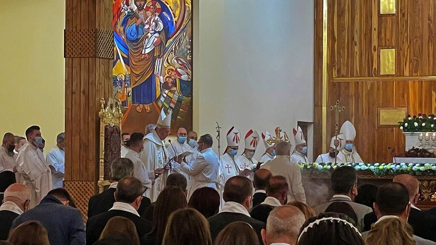 El papa abrió la misa de acuerdo al rito oriental, en la iglesia de San José, en el centro de Bagdad, con traducción en árabe y arameo.