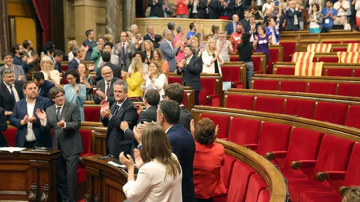 Los diputados de la oposición, Ciudadanos (liberal), Partido Socialista de Cataluña (PSC) y el conservador Partido Popular de Cataluña (PPC), abandonaron el hemiciclo antes de la votación, dejando algunos de ellos sobre sus escaños vacíos banderas catalanas y españolas.