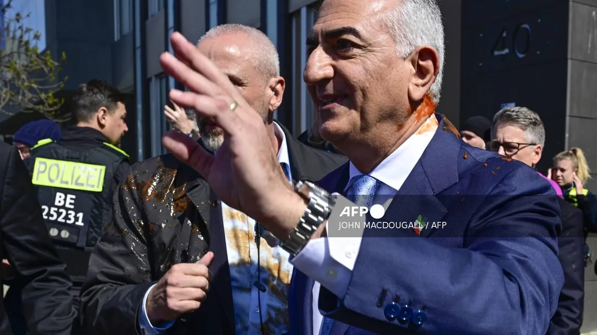 De visita en Berlín en el marco de una gira europea, tras pasar por Suecia e Italia, donde se reunió con algunos parlamentarios pero con ningún representante gubernamental, el hombre de 65 años fue recibido por partidarios, pero también por opositores. Uno le arrojó un líquido rojo antes de ser detenido por la policía.