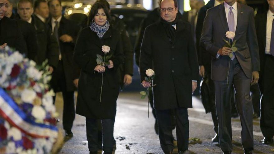 Hollande, Obama y la alcaldesa de París, Anne Hidalgo, depositaron flores delante del local antes de observar un momento de recogimiento. Acto seguido, François Hollande acompañó a Obama hasta su coche.