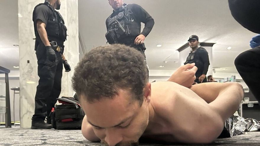 Las imágenes de las cámaras de seguridad difundidas por Trump en Truth Social muestran a una persona que se precipita a través del arco de detección de metales situado a la entrada del salón donde se celebraba la gala, y a varios miembros de las fuerzas del orden desenfundando sus armas.