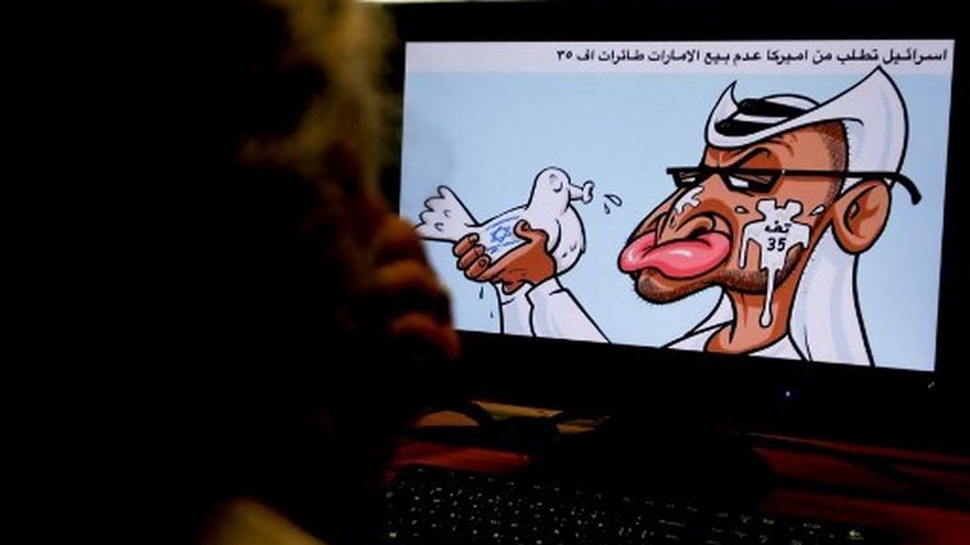 Con el título "Israel pide a América (Estados Unidos, NDLR)que no venda los F-35 a Emiratos Árabes Unidos", el dibujo muestra a Al-Nahyan con una paloma en la mano con la bandera israelí que le escupe a la cara. Y con los escupitajos en su cara aparece escrito: "F-35".
