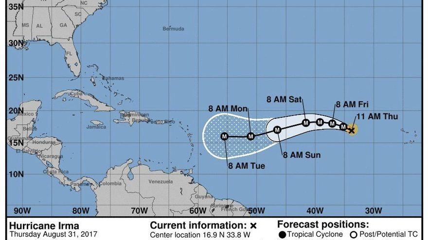 Irma por el momento no conlleva un peligro potencial para zonas costeras y se encuentra a 1.520 kilómetros (945 millas) al este de las islas de Sotavento (Antillas Menores), las cuales deben vigilar el progreso de este ciclón, de acuerdo al centro meteorológico.
