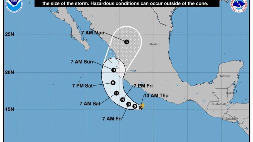 El Servicio Meteorológico de México informó de que "se mantiene zona de prevención por efectos de huracán desde Playa Pérula, Jalisco, hasta El Roblito, en Nayarit".