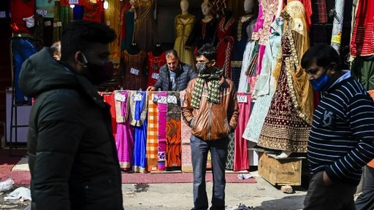 Personas caminan en India frente a locales de ventas de ropas y telas / AFP