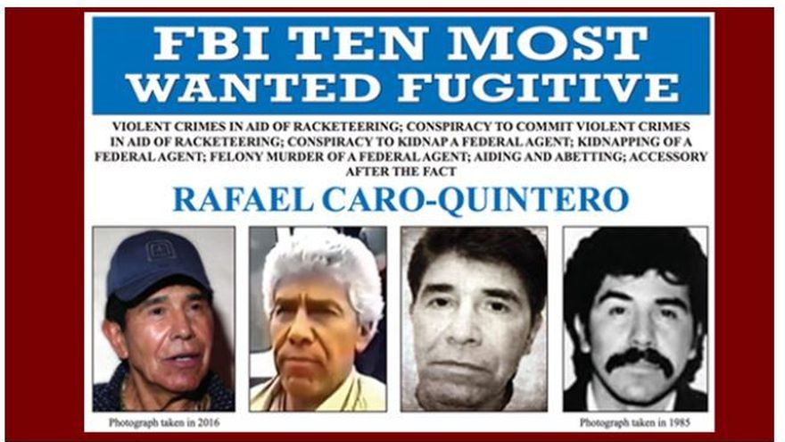 Rafael Caro Quintero, exjefe del cartel de drogas de Guadalajara en México, buscado por el secuestro y asesinato en 1985 del agente especial antidrogas Enrique Camarena "Kiki" Salazar, ha sido agregado a la lista de los “Más buscados” de la Oficina Federal de Investigaciones (FBI).