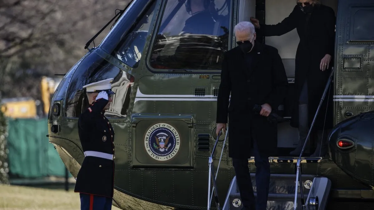 Joe Biden , presidente de EEUU, deciden del helicóptero Marine One. / AFP