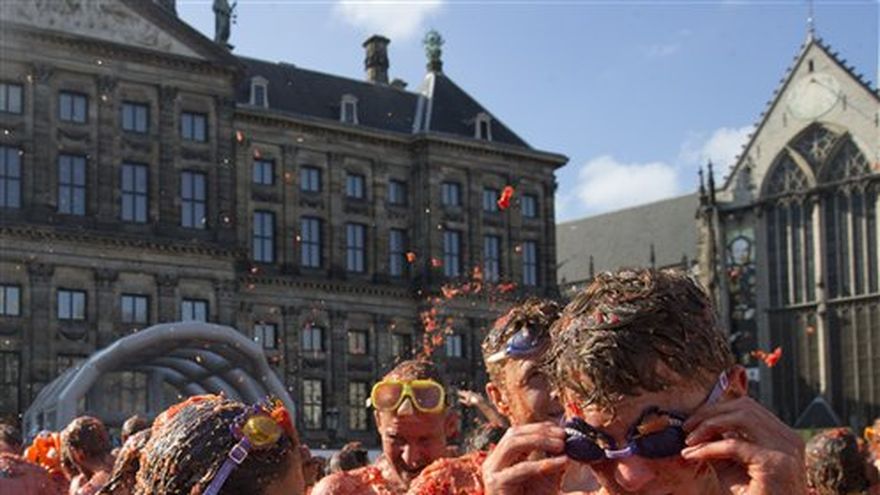 Cientos de jóvenes holandeses convirtieron este domingo la céntrica plaza Dam de Ámsterdam en una tormenta de jugos rojos, mientras se lanzaban sin piedad unos a otros tomates demasiado maduros.