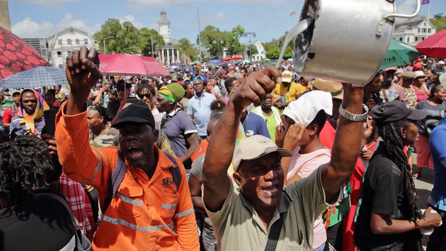 Entre 1.000 y 2.000 personas se congregaron en la mañana en el centro de Paramaribo con consignas en contra del alza en los precios de los alimentos, la gasolina y la electricidad, acusando al gobierno de Santokhi de corrupción, constató un periodista de la AFP. "¡Chan fuera!", repetían.