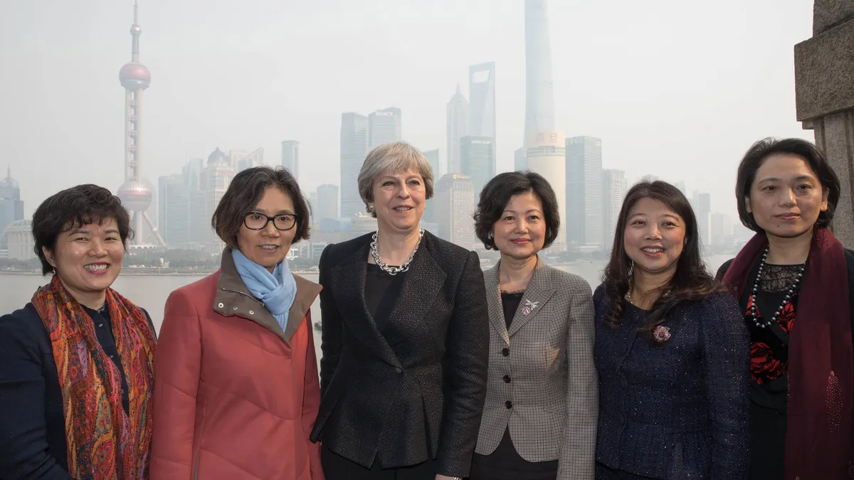 La primera ministra británica, Theresa May, posa junto a líderes empresarias chinas en Shanghai (China) este 2 de febrero / EFE