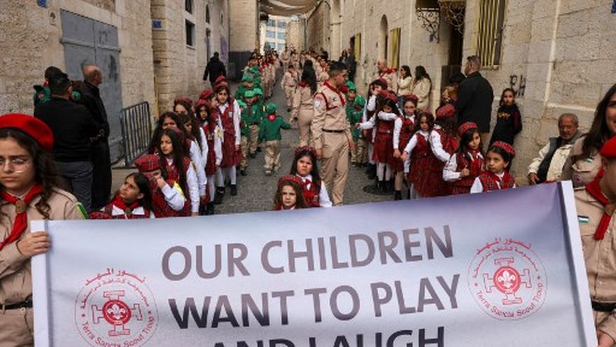 La ciudad se animó a principios de la tarde con un desfile de scouts, algunos de ellos enarbolando pancartas con mensajes como "Detengan el genocidio en Gaza" y "Nuestros niños quieren jugar y reír".