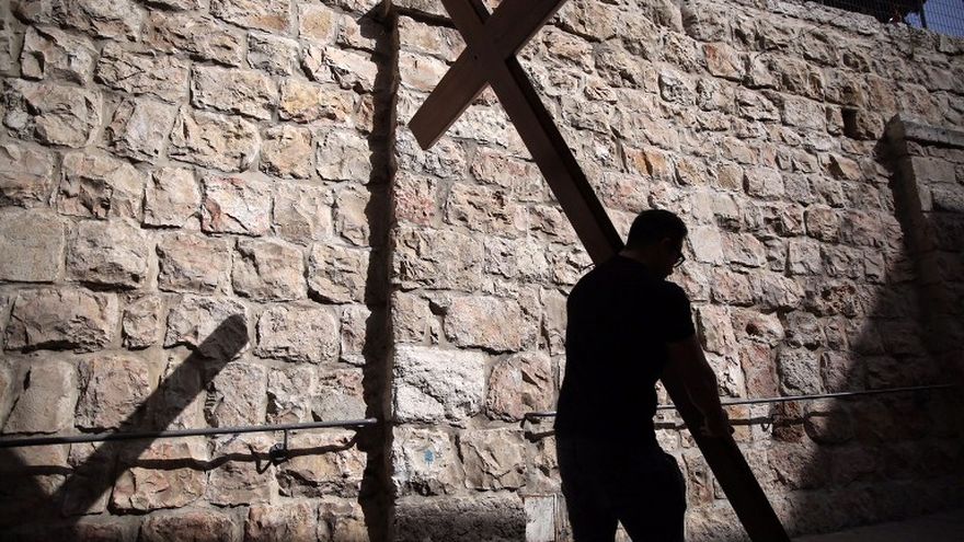 En el marco de las celebraciones previas a Pascua, los fieles recorren en procesión la Via Dolorosa, situada en el sector oriental de Jerusalén, palestino aunque ocupado y anexionado a Israel desde 1967.