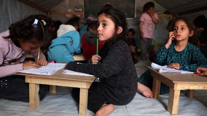 Decenas de niños palestinos asisten a una clase en el sur de Gaza: levantan el dedo, mordisquean los lápices, ojean el cuaderno de su vecino... Pero su escuela es una tienda de lona en medio de este territorio devastado.