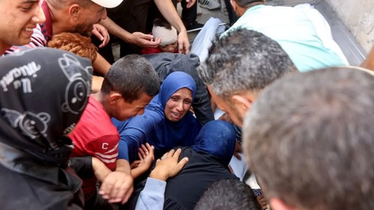Alrededor de ella, mujeres que lloran, mientras que el ruido de las explosiones resuena aún en el territorio palestino devastado por la guerra desencadenada por el ataque sin precedente de Hamás el 7 de octubre de 2023.