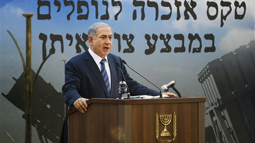 El primer ministro israelí Benjamin Netanyahu pronuncia un discurso para conmemorar a los soldados que murieron en la guerra de 2014 en Gaza, durante una ceremonia en el Monte Herzl en Jerusalén, el lunes 6 de julio de 2015. / AP