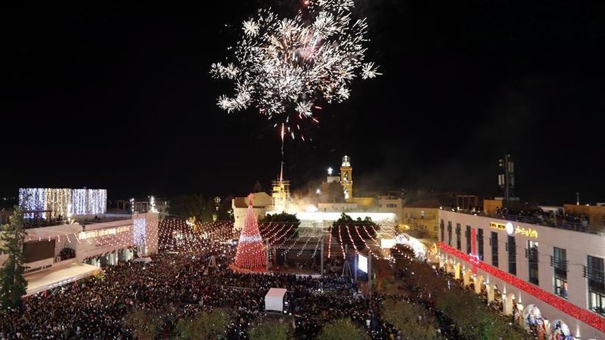 Miles de palestinos y turistas se congregaron hoy en la plaza del Pesebre para el encendido anual del enorme árbol con el que se inaugura oficialmente la Navidad en el lugar del planeta en el que, según la tradición cristiana, nació hace más de 2.000 años Jesús de Nazaret.