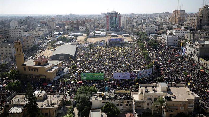 La multitud, agitando banderas amarillas de la formación nacionalista que fundó, Al Fatah, y sosteniendo carteles con el rostro de Arafat, había llegado por la mañana desde todo del enclave costero a la plaza de Al Saraya, en el centro de la ciudad de Gaza, para unirse a la masiva manifestación.