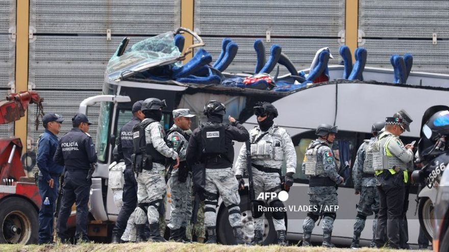 Diez personas murieron y 41 resultaron lesionadas luego de que un tren de carga arrollara un autobús de pasajeros de dos pisos en el Estado de México. / AFP