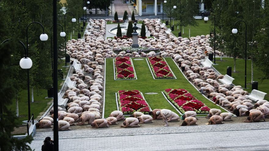 "Hoy, la tierra de los mil lagos, se convirtió en el país de los mil desnudos", dijo a la AFP Spencer Tunick, famoso por sus tomas de multitudes completamente desnudas, mientras que los voluntarios eran guiados por altavoz.