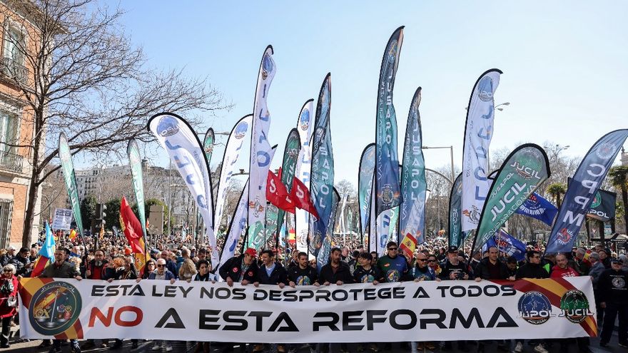 Tras una pancarta en la que se podía leer "esta ley nos pone a todos en peligro", los sindicalistas marcharon en presencia de dirigentes del derechista Partido Popular, principal partido de la oposición, así como del partido de extrema derecha Vox.
