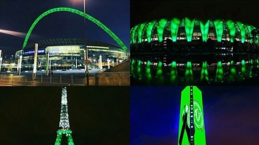 Edificaciones icónicas y estadios se tiñeron de verde este martes como recuerdo a la plantilla del equipo brasileño Chapecoense, accidentado mortalmente el lunes cuando esperaba por aterrizar en Medellín.