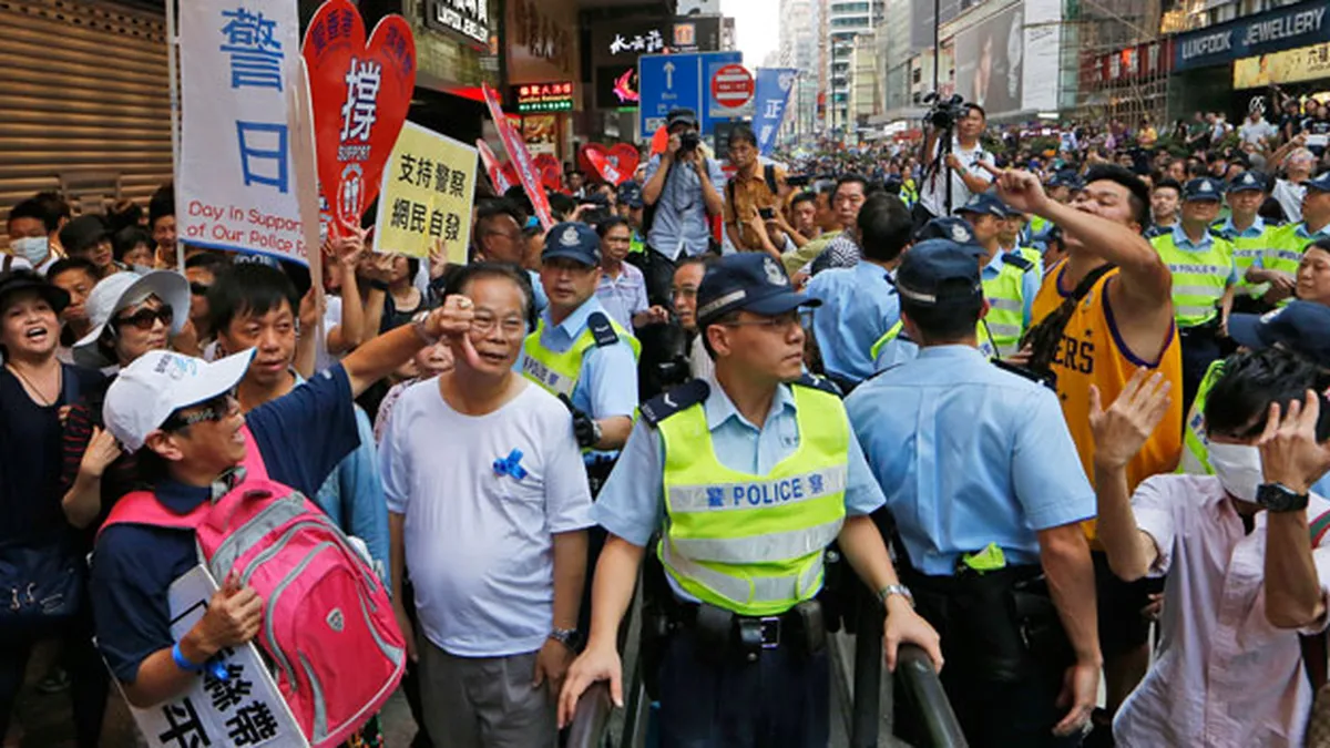 Multitud trata de cargar contra protesta Hong Kong