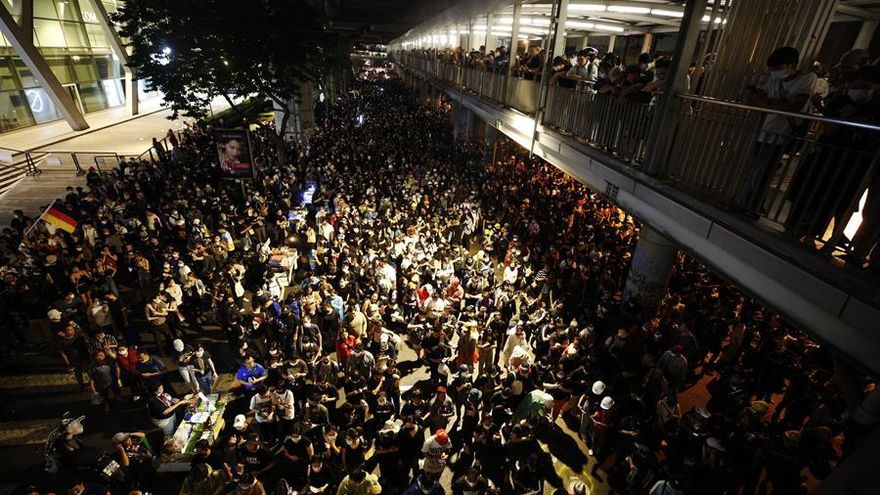 Miles de personas se congregaron en la intersección de Ratchaprasong, escenario habitual de manifestaciones en el centro financiero de la capital tailandesa, para pedir reformas democráticas y protestar contra las cargas policiales de la víspera en las inmediaciones del Parlamento, que se saldaron con 55 heridos.