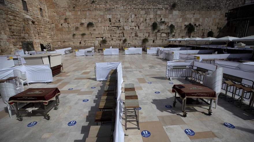 El Muro de las Lamentaciones de Jerusalén, principal lugar de culto judío, se prepara para garantizar un rezo seguro con el regreso de fieles este domingo cuando Israel comienza una desescalada tras un mes de confinamiento.