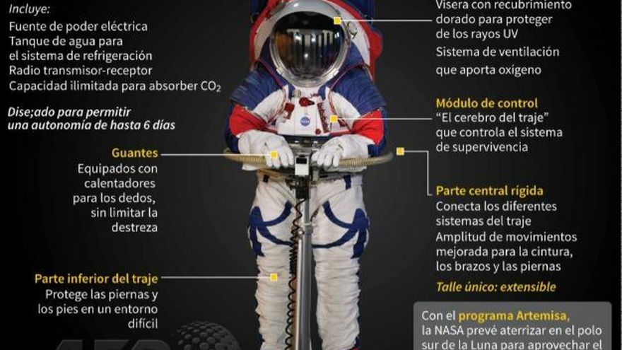 En realidad habrá dos tipos de traje: uno para caminar en la Luna, blanco con banderas azules y rojas, llamado "xEMU" (acrónimo en inglés de la Unidad móvil de exploración extravehicular).