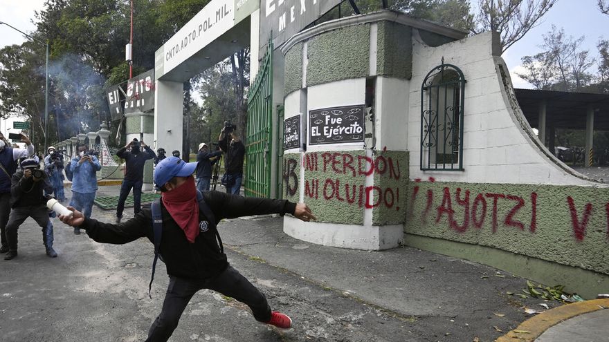 Tras una serie de discursos de padres de las víctimas y líderes estudiantiles, jóvenes encapuchados lanzaron piedras y explosivos artesanales al interior del Campo Militar 1, resguardado por agentes antimotines.