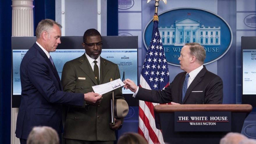 Durante un anuncio hábilmente puesto en escena, su portavoz Sean Spicer entregó al secretario de Interior, Ryan Zinke, un cheque de 78,333.32 dólares, correspondientes a los primeros meses de salario de Trump en la Casa Blanca.