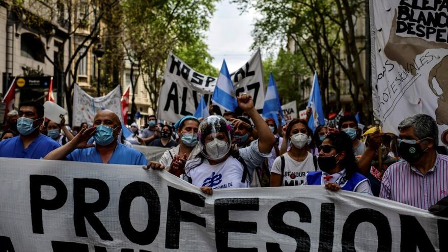 Buenos Aires/Más de medio millar de enfermeros e instrumentistas quirúrgicos marcharon este jueves por el centro de Buenos Aires en reclamo de aumentos salariales, reconocimiento profesional y mejoras en las condiciones laborales en plena pandemia de covid-19.