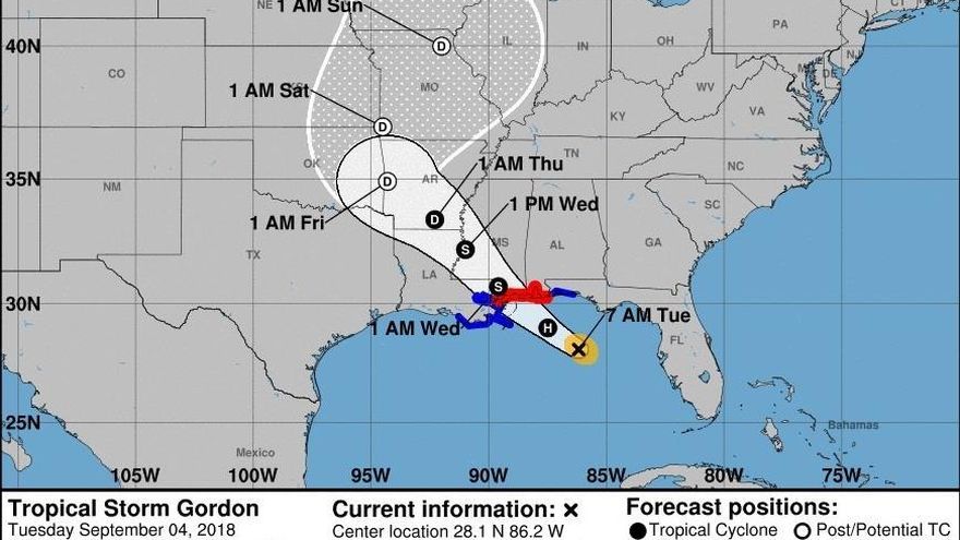 La previsión de los meteorólogos es que Gordon toque tierra como huracán en la zona baja del "valle del Mississippi, en la costa norte-central del Golfo, esta noche o temprano en la mañana del miércoles", para luego moverse rápidamente hacia el interior.
